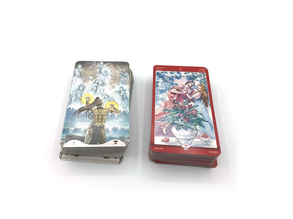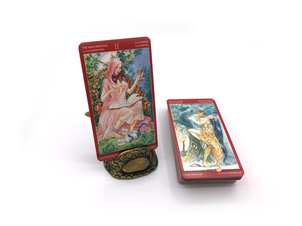 The best tarot deck is the one you choose to use. A comparison review might help you decide between Erotic Fantasy vs. Sexual Magic Tarot. Both of these oracle decks contain adult imagery, so I selected the more PG13 card for the review. Both decks come from the same publisher, so the materials are very similar. The Erotic Fantasy deck is borderless, which is a more popular design style. Also, the cards only have numbers and icons to help you identify them, and that can be a little tricky if you are a beginner. The Sexual Magic cards have words written on the card in different languages and a more realistic illustration style to the figure’s clothing and environment.