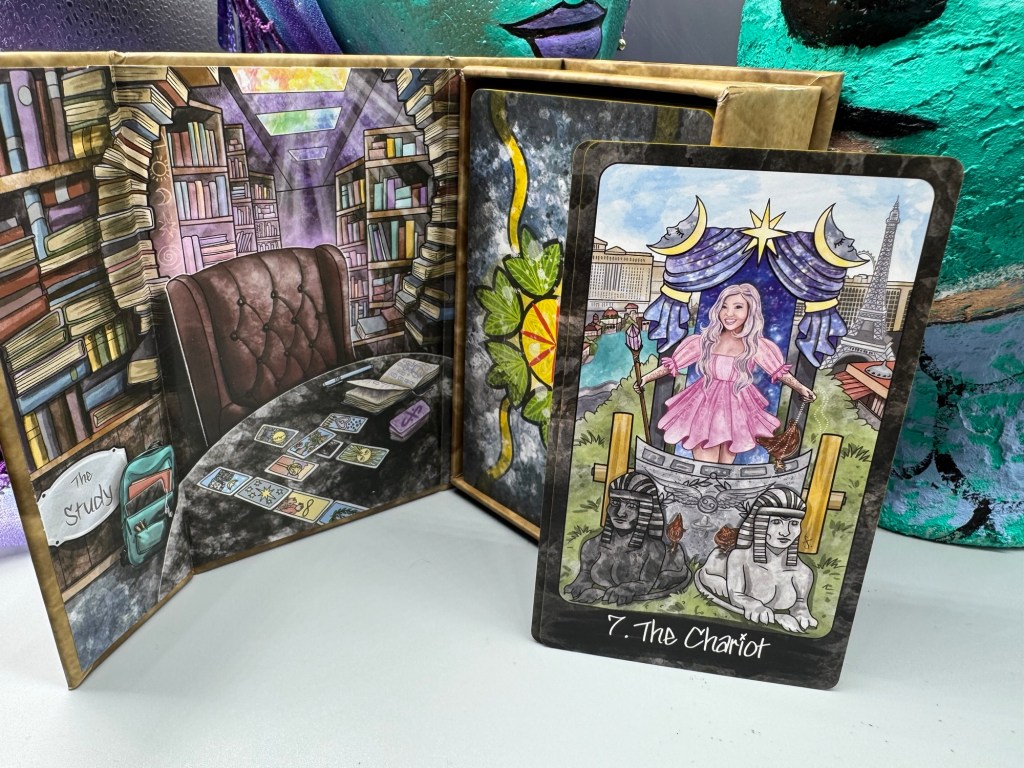 - Box: Magnetic book-style box with lush illustrated interior—reading table, bookshelves, Akashic vibes
