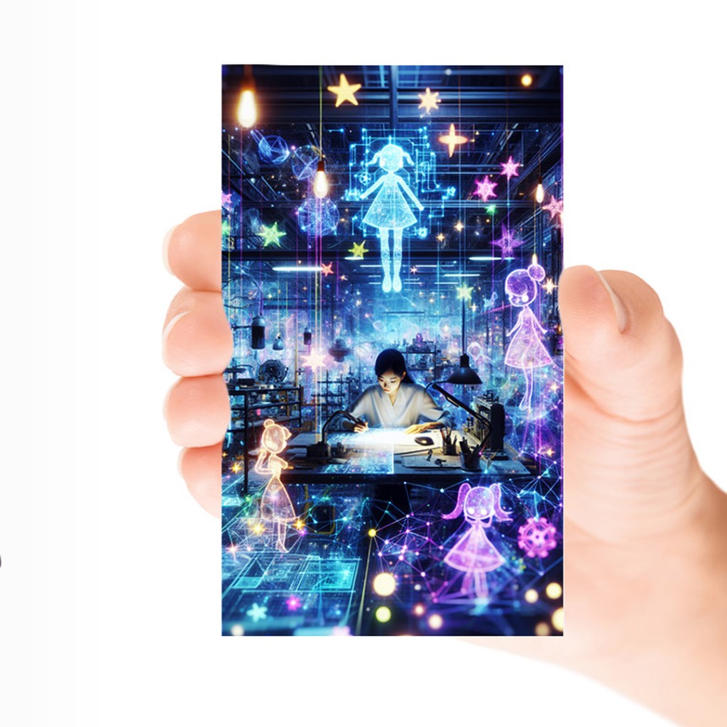 | Holographic Figures & Stars | Visionary breakthrough. Neon sketches and floating symbols evoke limitless possibilities, future thinking, and the magic of inspiration. |