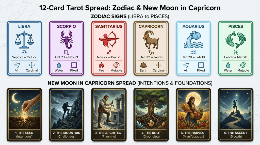 - Card 7 (Capricorn): Patterns in your ambition, your public life, and your sense of duty.